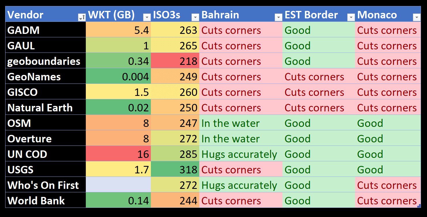 During this review, I also checked the borders around Monaco and Estonia. Below is a summary of the accuracy of the borders around these three countries, the size of their geometry in WKT format and the number of unique country codes.