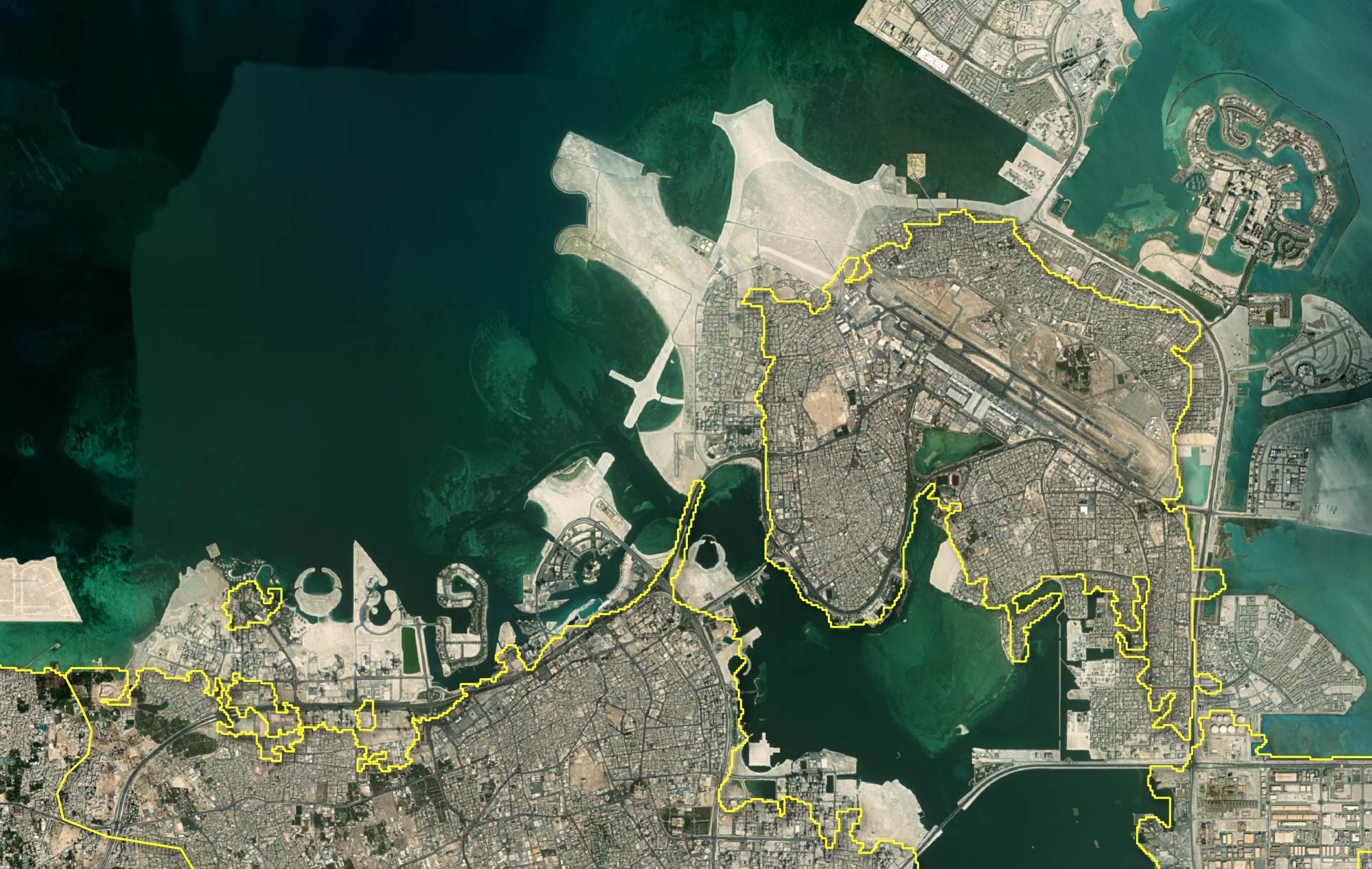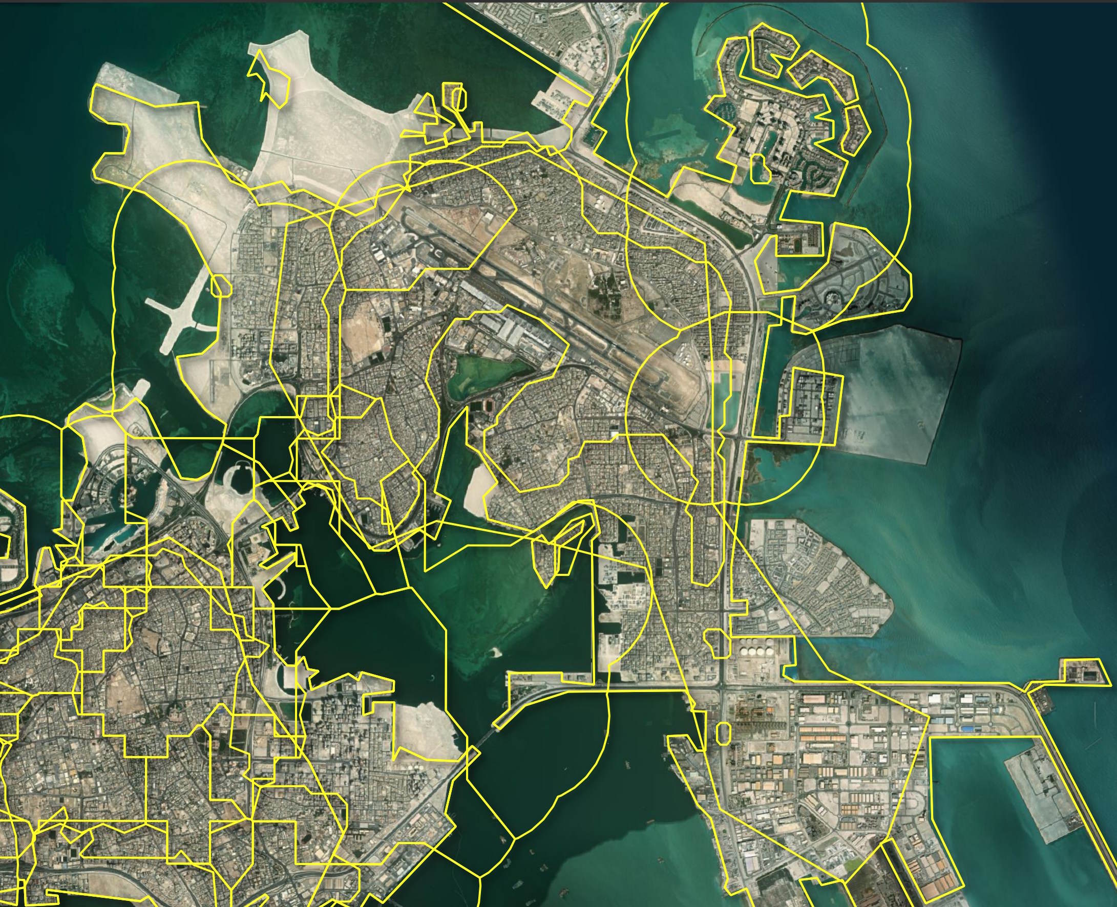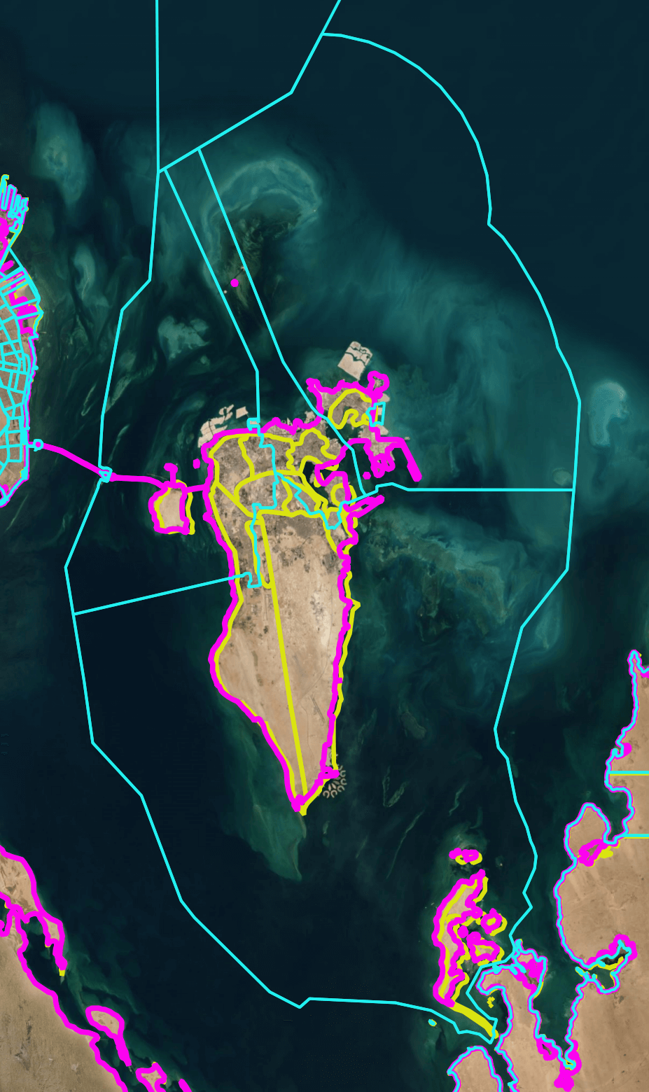The following shows the overlap between the datasets that cut corners around Bahrain's Northern coast. I excluded WOF as it made the map too complex.