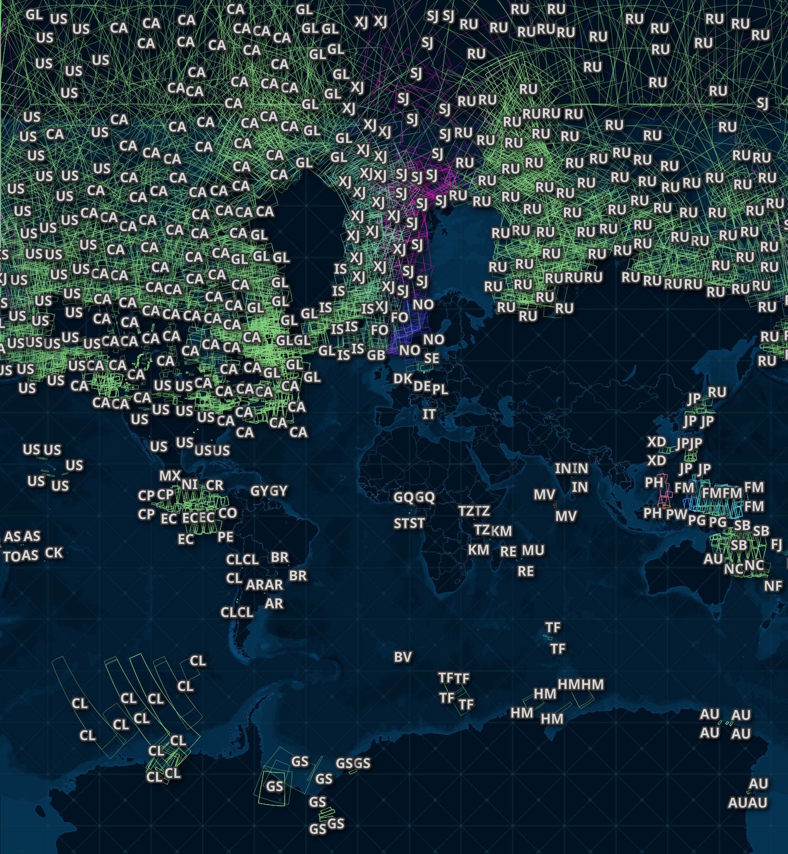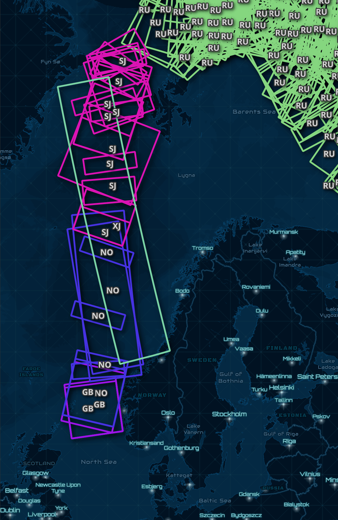 Below are some of the planned footprints between Greenland and Scandinavia. I've labelled each footprint with the nearest ISO2 country code in Overture's dataset. This image was taken while the above enrichment job was still running so there aren't as many footprints as in the final dataset.
